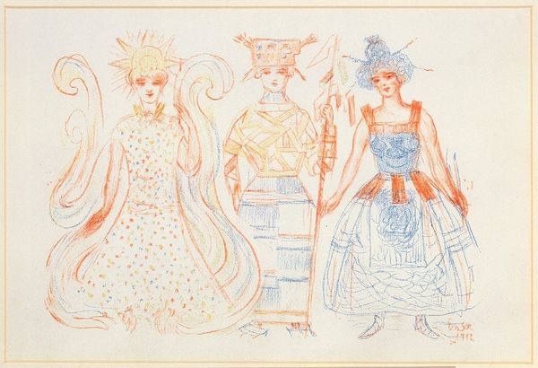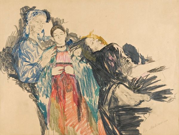 Editor: Here we have Filipp Malyavin’s drawing titled "Children," and what jumps out at me are these almost aggressively vibrant pastel colors. I’m curious to hear your take; what do you see in this piece? Curator: Oh, this one hums with a certain energy, doesn’t it? It’s not just the colors but also the deliberate sketchiness. Malyavin seems to have captured a fleeting moment of childhood, less concerned with photographic realism and more focused on conveying the vivacity. And those splashes of blue at the bottom—are they a river? Or pure abstract glee? What do you think? Editor: The blue makes me think of water, yes. It could also be abstract energy, mirroring the energy of the figures above. Is that why it’s categorized as Russian Avant-Garde? Curator: Exactly! You’ve picked up on a key point. While Malyavin was rooted in Realism initially, his later works, including this, leaned toward the experimental spirit of the Russian Avant-Garde. The bold color choices, the simplified forms—it's all part of pushing beyond traditional representation. Makes you wonder what these children are chattering about, doesn’t it? Editor: It does. I also appreciate the different perspectives on the children, not just focusing on one uniform viewpoint. It creates an almost frenetic effect that mimics the reality of children. Curator: Absolutely, and I love how you use that language. "Frenetic effect" encapsulates that beautiful chaos so perfectly. It's a reminder that art doesn't always have to be perfectly polished to be powerful. Sometimes it’s the raw, unfiltered glimpse that hits us hardest. Editor: Well, I definitely see the frenetic energy now! Thanks so much. I’ll keep an eye out for Malyavin. Curator: My pleasure! Always wonderful to share these glances with another curious soul!
