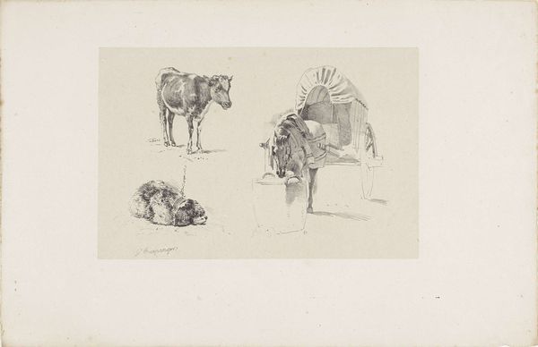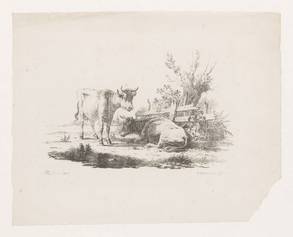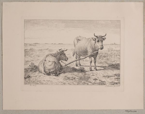 Curator: Today, we are looking at Alfred Verwee's etching, "Twee runderen," created sometime between 1848 and 1895. Editor: My first thought is, there's a stark simplicity to it. These two cows... they just *are*. There's an honesty, an unvarnished quality that's incredibly grounding. It’s like stepping into a quiet moment in the pasture. Curator: Indeed. Verwee's realism captures a seemingly mundane scene with deliberate precision. Note how he uses the etching technique to create varying densities of lines, modeling the forms of the animals and giving a sense of volume despite the minimal tonal range. Editor: I find myself pondering their inner lives, if you will. Are they friends? Competitors? Or just two creatures sharing the same patch of grass on a lovely Dutch afternoon? I wonder if Verwee saw this scene regularly. What does he want me to observe? Curator: Such ponderings can enrich the experience. Yet I also encourage close consideration of the formal structure. Observe the careful placement of the animals in relation to one another and the horizon. The composition invites the eye to follow a logical progression through the sparse landscape. Consider too the function of the seemingly empty background—does it not augment the visual focus onto the materiality of the rendered animal forms themselves? Editor: Well, it does create this lovely sense of... almost voyeurism, as if we’re observing the animals in their natural environment. There’s something wonderfully peaceful about seeing creatures just *being*. And I can feel the texture too. Curator: Precisely, it's this ability to evoke haptic qualities through purely visual means that renders this work worthy of continued reflection. Verwee presents us with the quotidian, yet the level of engagement that the work elicits transforms the seemingly commonplace into something more substantial. Editor: Agreed. There is a tangible realness that goes beyond subject and becomes feeling. It reminds me to appreciate the seemingly insignificant events around us, those quiet shared moments of simple existence. Maybe art isn't about grand gestures as much as careful observation.