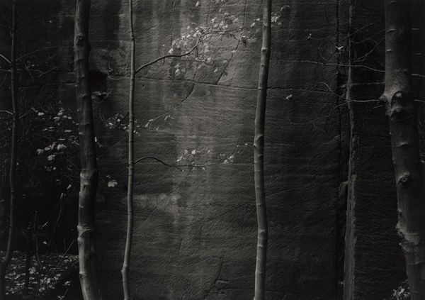 Curator: This image presents an arresting study in contrasts, quite austere, wouldn't you say? Editor: Yes, there's a starkness to it. Immediately, I'm thinking about surveillance and restricted vision, like peering into a space you’re not meant to see. It is discomforting. Curator: Indeed. We are looking at “Tract House #2,” a gelatin silver print from 1971 by Lewis Baltz. Notice how he emphasizes the materiality through a rigorous geometry and restricted grayscale? Editor: Thinking about the '70s and the tract housing boom, it feels like a commentary on suburban alienation and the oppressive architecture of the everyday. The limited palette reads almost like erasure or, better still, negation. Curator: The photograph embodies conceptualism through its deliberate removal of subjectivity and the depersonalized approach to the subject matter. Its beauty, for me, lies in its minimalist precision, the stark rectangles almost floating on the textured wall. Editor: It also brings to mind histories of labor and social exploitation tied to these developments. It evokes conversations about the construction, about the lives lived within those prefabricated structures, who benefits, who doesn't. Curator: Interesting how you draw broader sociopolitical significance from it. I see more of a visual system based on repetition, interruption, and surface—elements of minimalism brought into dialogue here. It's a statement on form, above all else, no? Editor: Well, even formal qualities aren’t produced in a vacuum. The rigid lines and washed-out tones, whether intentionally or not, still communicate about the cultural conditions of the period. But of course the impact may be due in large part to our vantage now, fifty years after its creation. Curator: Perhaps both elements are equally relevant, as a photograph such as this encourages prolonged observation to appreciate its inherent conceptual complexities as much as its sociopolitical connotations. Editor: Absolutely. An image that holds discomforting formal strength alongside critical socio-historical narratives is, at its essence, powerful.
