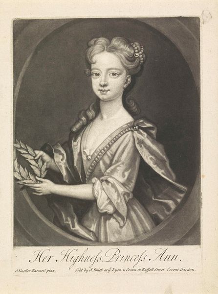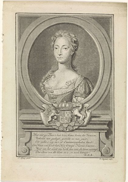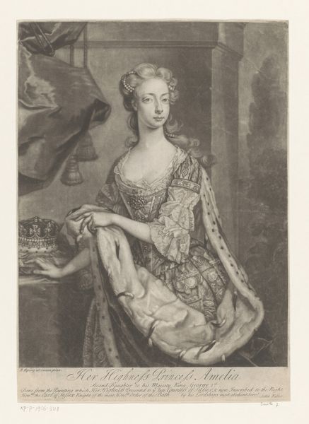 Editor: This is "Portret van Anna van Hannover" by John (II) Faber, an engraving from between 1734 and 1756. The detail is striking. There's almost a formality and a rigidness to the image, despite the lace and flowing robes. What is your reading of this portrait? Curator: This engraving really encapsulates the function of portraiture within 18th-century society, particularly concerning the public role of women in dynastic power. The portrait, likely commissioned or circulated for political purposes, reinforces Anna's status and role. Note how her hand rests proprietarily on the crown. The historical context is everything here. This is less about capturing a likeness, and more about manufacturing a visual representation of power. Consider how this image would function: who was its intended audience, and what message were they meant to receive? Editor: So it’s less about *her* and more about the message *she* is meant to convey? Curator: Precisely. Think about how visual imagery solidified ideas about lineage, authority, and even national identity. In this era, engravings such as these played a crucial role in constructing and disseminating specific narratives. Her finery, her composure, even the drapery – it all coalesces to project an image of established power and legitimacy. How do you think it does that? Editor: I see that all the little details—the fabric, the way the crown is placed beside her, and even her hair, seem deliberate. There’s so much intention behind every element. I’d not really thought about how actively these portraits work to cement a particular view. Curator: Exactly! Next time you look at a historical portrait, consider it not just as a window into the past, but as a carefully constructed political statement. Editor: I will. That’s a completely new way for me to approach this sort of piece.