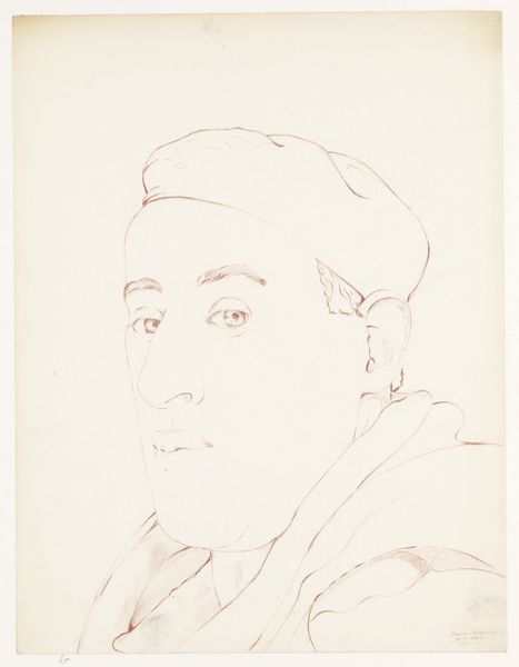 Curator: Let’s discuss "Zelfportret met pet: B-1-1, 16 februari," a self-portrait attributed to Cor van Teeseling, potentially created in 1942. Editor: There's an immediate delicacy and fragility to this piece. The very thin lines and subtle shading, mostly in one shade, suggest vulnerability. Curator: Indeed, the linear quality is striking. Look at the deliberate economy of line—how a few strokes define form, especially around the eyes and the beret. It employs a refined formal reduction, minimizing details for maximum impact. It is all done in pencil on paper, drawing. Editor: That's what fascinates me. Consider the simplicity of the medium, pencil on paper, during a tumultuous period. The material availability, its portability. A pencil was a tool accessible even amidst hardship, making this act of self-representation almost an act of resilience. Curator: You raise an interesting point about resilience. Semiotically, the gaze, slightly averted, could symbolize introspection or a lack of engagement. Its rendering of form is achieved purely through gradations of tonal value and, of course, through a masterful manipulation of lines and contrast. Editor: Exactly! It’s about the access to that material during a period of duress, to render an identity or expression within the restrictive times. The labor and the art, both acts defying the restrictions of place. It is realism that is heightened because the self-portrait does not have colour. Curator: Absolutely. And as for the hat, it contributes to the formal composition with its almost circular line on the top portion of the head. Overall the simplicity offers visual clarity with that minimalist composition which lends itself to psychological interpretation. Editor: I am interested in what that beret means as part of what makes this. That material aspect of representing identity, or culture through fashion and materials, perhaps, amidst wartime limitations? It asks one to wonder what sort of labor made it, whether it was store bought or homemade, mass produced or custom… Curator: Considering these combined formal and contextual readings enhances our experience of art in an original and thoughtful way. Editor: True; examining this work's process, access, and materiality against its creation time reframes the piece. A great work to delve into today.