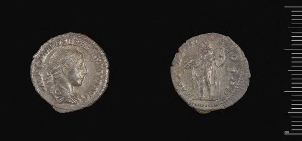 Curator: Here we have a denarius of Julia Soaemias, currently residing in the Harvard Art Museums. Editor: It's remarkable how much information is conveyed in such a small, worn object. The low relief gives it a somber, almost ghostly presence. Curator: Indeed. Coins like this one weren't just currency; they were potent tools for disseminating political and social messages. Julia Soaemias, as the mother of Emperor Elagabalus, is consciously projecting power and legitimacy through her image. Editor: The rigid profile portrait, framed by that inscription, it’s a clear assertion of authority through established visual language. The silver itself, even tarnished, still reflects a sense of value. Curator: And on the reverse, we see likely a depiction of the emperor, further solidifying the dynasty's image and hinting at themes of piety and imperial stability. Each element, from the inscription to the figure's posture, carries symbolic weight. Editor: Absolutely. It's fascinating to consider how this object, designed for mass circulation, functioned as a miniature propaganda machine. The formal structure reinforces its intended message. Curator: It serves as a tangible link to a complex historical narrative. It helps us understand how ancient rulers manipulated symbols to shape their public image and secure their legacy. Editor: Seeing this coin has highlighted how potent material objects can be in shaping perceptions and cementing power through visual strategy. Curator: A poignant reminder of the enduring power of symbols across millennia.