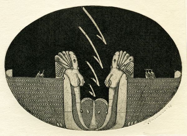 Oleksandr Aksinin created this exlibris for Hnatyshak using etching techniques, likely in 1978, judging by the signature. The image presents a fascinating combination of symbols: an owl, often associated with knowledge, whose eyes have been replaced with scissors. Below, we can see books, all of which suggests a commentary on the acts of cutting, editing, and interpreting knowledge. Aksinin worked in Soviet Ukraine, where artists often faced censorship and ideological constraints. Exlibris, or bookplate art, became a subtle medium for expressing personal and sometimes subversive ideas. Consider how the act of cutting, represented by the scissors, might symbolize the censorship that was typical of Soviet institutions at that time. The artist may also be asking us to think about the role of intellectuals and their responsibility to challenge the status quo. To understand the artwork better, we can research the cultural context of Soviet Ukraine, looking at its policies on artistic expression and the experiences of artists during that era. Understanding art is always a product of its time, as well as a reflection of cultural and social values.