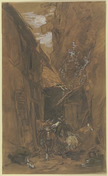 Victor Hugo created "Souvenir of a Castle in Vosges" using ink and wash on paper. At first glance, a dramatic scene unfolds. The dark, saturated washes evoke a sense of foreboding, with a castle rendered in stark contrast against the gloom. Hugo masterfully employs chiaroscuro, a technique where strong contrasts between light and dark create depth and drama. The castle, seemingly perched atop a craggy precipice, becomes a symbol of Romantic ideals. Its architectural form, though vaguely defined, suggests a certain grandeur. The overall composition feels less like a literal depiction and more like an emotional landscape. Consider how Hugo uses the medium itself to convey meaning. The fluid, almost chaotic application of ink and wash mirrors the sublime, untamed aspects of nature, reflecting a broader cultural fascination with the power and mystery of the natural world. In its deliberate ambiguity, Hugo's work challenges the viewer to construct their own narrative, to find meaning within the interplay of form, shadow, and light.