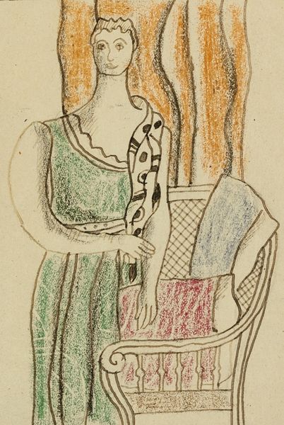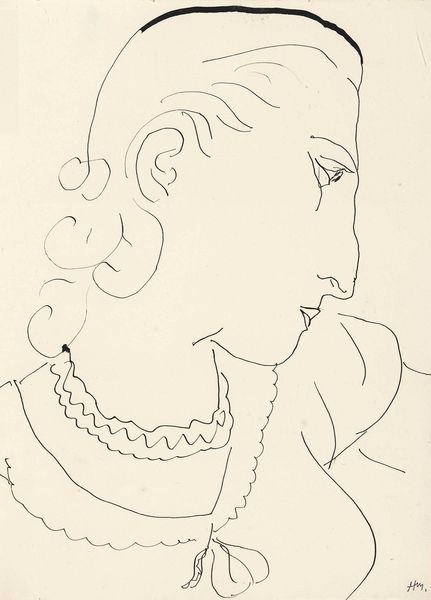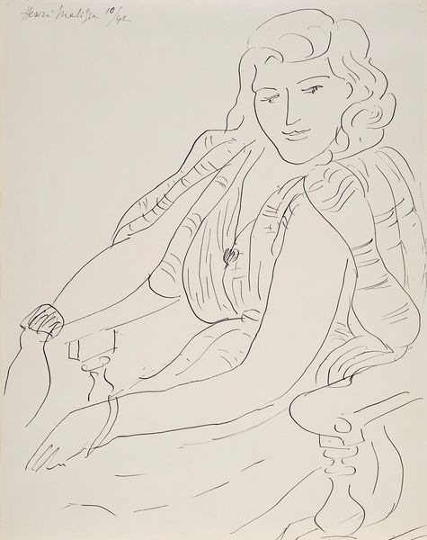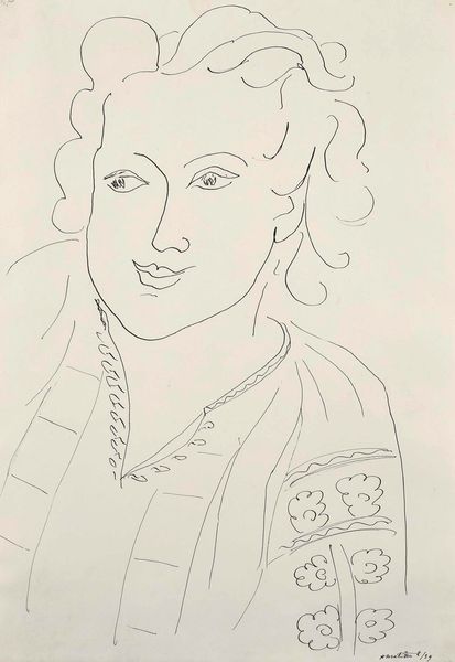 Curator: Before us is "La blouse roumaine," a blue ink drawing completed by Henri Matisse in 1939. The piece is a fine example of the artist’s dedication to line and form. Editor: My immediate reaction is a feeling of stark simplicity and poised elegance. There's a quiet dignity in the figure’s posture and gaze, though the minimal linework keeps it from feeling overtly sentimental. Curator: It's part of Matisse's long-standing exploration of the female figure and his engagement with patterns. Looking at this in 1939, what statements might this seemingly intimate portrait have made about feminine representation amidst social and political upheaval? Editor: Certainly, the choice to focus on what appears to be traditional Romanian dress invites discussion of cultural identity. Considering Europe on the eve of WWII, was Matisse subtly celebrating or even idealizing regional cultures against a backdrop of encroaching homogenization and conflict? Or romanticizing peasant women? Curator: Or perhaps challenging Western sartorial conventions and imposed ideas of beauty, which frequently lacked inclusivity of marginalized voices at the time. But how much does that context affect our understanding of it? Is the socio-political climate essential to understanding it? Or does that add an extra layer of meaning to an otherwise apolitical portrait? Editor: For me, context is key, because how we read a seemingly “apolitical portrait" through our own socio-political lens always matters. Without it, we risk projecting ahistorical readings onto the artwork. Consider the power structures embedded in the artist-model dynamic, especially in historical portraits. The gendered, economic, and social disparities shape representation. Curator: Interesting! I think that we cannot strip away those cultural and historical contexts, we can certainly become more nuanced interpreters of the piece and have a fuller appreciation. Editor: Precisely. And by considering the sociopolitical forces, we start to see the rich textures beneath this deceptively simple blue ink drawing.