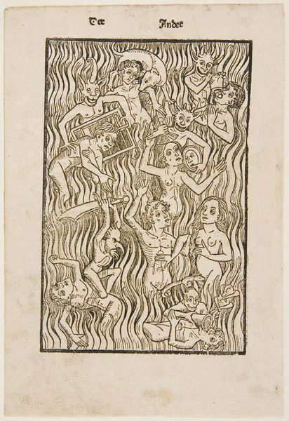 Editor: This is Jules Pascin’s "Bacchus", a small etching. The figures seem caught in a moment of revelry, but there’s also a sense of vulnerability in their postures. What layers do you see at play here? Curator: Pascin, writing "Bacchus" into the print itself, invites us to consider the complicated history of representing the god of wine. It's more than just celebration; it's about power, transgression, and who gets to participate, isn't it? Editor: It seems so... intimate and public at the same time. Curator: Exactly. Pascin highlights the tension between individual experience and collective identity. The figures' nudity, their gestures, all contribute to this discourse. Is this liberation or exploitation, or perhaps both? Editor: I hadn't thought of it that way. It makes me question my initial assumptions. Curator: That's the power of engaging with art, isn't it? It challenges us to look deeper, to consider multiple perspectives. I'm also intrigued by Pascin's choice to etch this image, as it is traditionally seen as a medium for the more classical arts. Editor: So, the piece almost questions itself. Thank you. Curator: My pleasure. Now you can carry a new lens for looking at art!