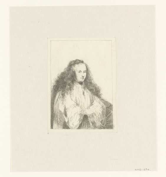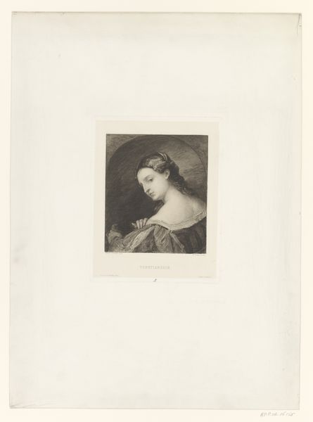 Eugène Smits created this etching, "Portrait of an Unknown Young Woman," during the late 19th century, a period marked by significant shifts in gender roles and class structures. This image prompts us to consider the identities and representations of women in art. The subject, rendered with soft lines and a gentle gaze, embodies a certain romantic ideal of femininity that was prevalent at the time. But who was this woman? The anonymity implied in the title suggests a tension between the individual and the archetype. Was she a member of the upper class? Does she represent an emerging middle class? The artwork, in its delicate execution, evokes a sense of intimacy and perhaps even longing. It invites us to reflect on the untold stories of women whose identities and experiences were often marginalized in historical narratives. This etching serves not just as a portrait but as a poignant reminder of the complexities inherent in representing identity.