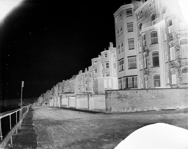 Editor: This is C. Bennette Moore’s "Untitled (New Orleans street scene)." The image is striking, almost ghostly, but also feels very familiar. What symbolic weight does this street scene carry, in your opinion? Curator: This inverted image evokes a sense of historical memory, doesn’t it? The figures become spectral, almost like ancestral figures haunting the space. Notice how the architecture, with its columns and balconies, speaks of a specific cultural heritage. Editor: It makes me think of the stories these buildings could tell. Curator: Exactly! And what stories do you think they whisper? This image connects us to a place, a time, and the complex history embedded within the very stones of New Orleans. It reminds us of cultural continuity and transformation. Editor: I never thought about a building as a symbol of cultural memory before. Thanks!
