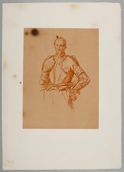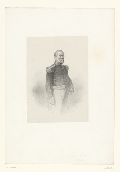 Curator: Ah, this pencil drawing! Here we have "Bildnis eines Mannes in Uniform, Dreiviertelfigur", which translates to "Portrait of a Man in Uniform, three-quarter figure." It is attributed to Otto Scholderer. Editor: He looks rather... proper, almost stiff, doesn't he? And serious, oh so serious. Is he someone of note? Or just someone playing dress up for the drawing? Curator: The uniform does lend him a certain gravity. Uniforms in portraits are interesting cultural artifacts; they're powerful symbols. Who is portrayed and why matters when creating an image with martial implications. I’d venture he embodies the strict hierarchical structures of the time. Editor: Interesting perspective. Still, all those severe angles leave me feeling a bit chilly, do you agree? And then you see the grid faintly visible. Does that give a hint that the work might have been created during academic study? It also suggests the whole picture could have been expanded upon; like some unfinished sketch left in an old book... Curator: Absolutely. The visible grid underneath shows the artist methodically constructed this work from the very beginning; it’s like looking behind the scenes of the creation process. This peek gives us a view into how the artwork’s shapes and composition are constructed with geometry—an exercise rooted in tradition and control! I would guess that because the artist utilized pencil as the chosen medium to portray our rather serious-looking military man. he tried to give it his upmost in craftsmanship. Editor: I keep wondering about what's implied though. A half-finished portrait. A life interrupted, maybe? The question is also there: "what happens next to the model? Was it for good, was it for worse?" And maybe it's just because art always leads me to speculate way too much beyond the picture and wonder about things around it! Curator: Isn’t that why we’re drawn to them in the first place? Because the best art whispers rather than shouts. We see hints of an earlier system and world, and then can use the same for the creation of our very own. The visible foundations intrigue me every single time. Editor: Maybe it is unfinished for the best then. Gives room for our imagination. I enjoyed the journey—thanks for showing this and giving an open perspective.