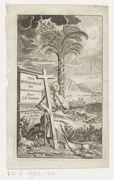 Editor: This is "Brandende korenschoof," or "Burning Stook," an etching made in 1672 by Albert Flamen. It depicts a bundle of wheat in a field, with a banner overhead. It seems very… stark. Almost barren. What strikes you about this print? Curator: The starkness you observe is quite telling. Given its material – etching, a repeatable print – and its date, this work likely circulated widely, acting as a commentary tied to broader social realities. We should think about the agricultural economy and the potential precariousness of resources, particularly during times of conflict or hardship. Editor: So you are saying the choice of subject, wheat, and the fact that it's so prominent is not accidental? How so? Curator: Exactly. Wheat, the raw material for bread, sustenance, life. The title hints at something being aflame, yet the image itself remains...static. Does this absence change how you interpret its significance, in light of production, labor, and consumption? Editor: Yes! I was only thinking about the final product, this singular image. But you are reframing the print’s circulation, mass production and, also, the anxiety around having food itself as important factors. What do you think is signified by the landscape, especially given how little detail there is in it? Curator: Good question. Its sparse rendering makes it more of a backdrop or a setting, if you will. A bare-bones agricultural setting reminds the viewer of production; It allows the sheaf of wheat to dominate the narrative. But what is that narrative, given it has to do with both burning and, inherently, consumption? Editor: Now I see it all connects—production, threat, and consumption! I learned to really think about the bigger context and not only personal aesthetic responses to the image. Curator: Precisely! Considering art through the lens of its material existence unveils its profound ties to societal forces, shifting our appreciation beyond the surface.