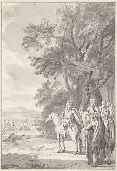 Jacob Ernst Marcus created this print, "Gezelschap in een bos" or "Company in a forest," using etching and burin techniques. We see a gathering of people in what appears to be a wooded area, possibly celebrating a marriage. Made in the Netherlands sometime in the late 18th or early 19th century, the scene provides a glimpse into the social customs of the time. The attire of the figures—the high-waisted dresses and formal coats—speaks to a certain level of society. It’s worth considering the role of institutions like marriage and family in shaping social structures of that era. How did these unions reinforce or challenge existing power dynamics? As historians, we dig into archives, scrutinize fashion trends, and analyze social etiquette manuals to reconstruct the world in which Marcus created this image. By understanding the social and institutional context, we can interpret this seemingly simple scene as a reflection of its time.
