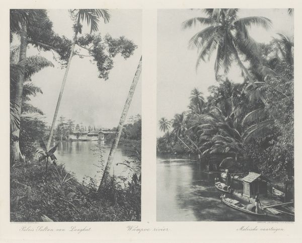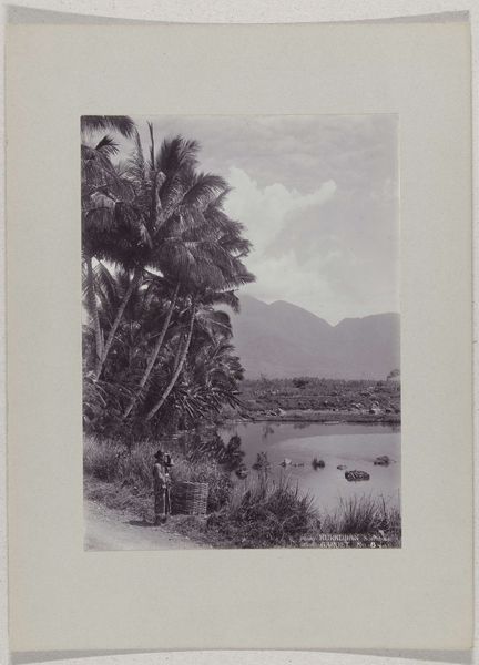 Editor: This gelatin-silver print, taken in the Dutch East Indies, probably sometime between 1895 and 1915, is called "Three Children on a Road near Garoet." The muted tones create a sort of stillness, a captured moment in time. What strikes you about the composition? Curator: The structure is meticulously ordered. Observe how the strong diagonal of the road bisects the composition, leading the eye from the foreground to the distant mountains. The palm tree, acting almost as a framing device, counterbalances the recessive perspective. It's a sophisticated play of planar recession and textural contrast. Editor: I notice the strong contrast between the lush foliage and the rather stark road. Does that signify anything to you? Curator: Consider the gelatin-silver printing process. The sharp tonal gradations render the minute details with exceptional clarity. Note how this meticulous reproduction enhances the textures – the rough bark of the palm, the smooth surface of the road, the delicate fronds. This interplay directs our attention to the essential formal qualities within the representational scene. Editor: So you’re suggesting that even though it's a scene of daily life, the photograph emphasizes form over content? Curator: Precisely. The children are diminutive figures, almost absorbed into the larger visual architecture. The work's significance resides in the controlled arrangement of shapes, lines, and tonalities, rather than merely depicting a narrative. Ask yourself if this is an objective depiction of its subject. Editor: I hadn’t considered how the technique itself could guide our reading of the work so much. I was focused on the subject first. Curator: Indeed. Through its structural elements, it offers an analysis, a perspective, on a place and time. What does the symmetry of the palm branches say, if anything? Editor: This has definitely shifted my perception of the work. Thank you.