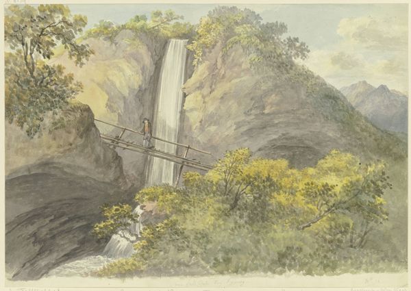 Editor: This is "L'Orido a Bellano sul Lago di Como" by Peter Birmann, circa 1805, a drawing in sepia watercolor. The overwhelming feeling is of depth created through line and shading. The sepia tones unify the craggy rocks, rushing water, and lush vegetation into a cohesive whole, but where does that dynamism arise from? Curator: The dynamism is inherent within the line. Observe how Birmann employs line to delineate form and texture, but most importantly, space. Note the stark contrasts in value that articulate recession. Do you see how the density of lines increases in the foreground and gradually decreases as it recedes into the distance? The interplay of light and shadow constructs volume, shaping our perception of the artwork and defining its various planes. Editor: Yes, I see it. The details in the foreground—the wooden structures, the texture of the rocks—are incredibly defined. Further back, everything softens, almost fades. So the contrast becomes a mechanism for drawing us into the image, structuring our perception and engagement with the work. Curator: Precisely. The lines establish a hierarchy of visual information, which in turn shapes our sensory experience of the depicted landscape. The consistent tonal range unifies these observations into an intense, evocative encounter, where all the representational components become subsumed under a visual impression. Editor: I understand now! The carefully calibrated deployment of line and the layering of shades shapes the work’s sense of depth and, therefore, our experience of viewing it. Thanks so much! Curator: An insightful reading. Studying the structural elements, allows a deeper engagement with how the piece as a whole functions aesthetically and intellectually.