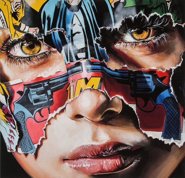 Sandra Chevrier made this intriguing artwork, La Cage Du Corps Jusqu’à L’âme, and it’s like a window into process. The layering, the tearing, the bringing together of different worlds; it’s all right there on the surface. I’m drawn to the way Chevrier uses the collage elements against the painted portrait. The vibrant colors and bold graphics of the comic book fragments contrast with the flesh tones of the face. The textures are so different, too. You’ve got the smooth, almost airbrushed quality of the skin bumping up against the rough edges of the paper. I keep coming back to the eyes, how they seem to gaze out from behind the mask of printed images. There's a real tension in the work that I find compelling. You might think of someone like Sigmar Polke, who also brought together high and low art in his work. But ultimately, Chevrier's voice is all her own. The piece really embraces the messiness and ambiguity that makes art so interesting.