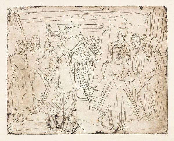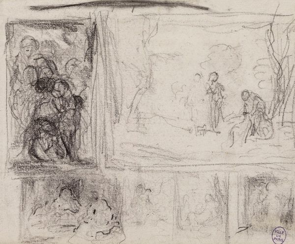 Curator: Looking at Leon Kossoff's "The Family of Darius before Alexander," it immediately strikes me as a scene teeming with emotion and movement. Editor: The chaotic lines and almost frantic energy do portray a powerful sense of turmoil. It’s like witnessing a pivotal historical drama unfolding. Curator: Indeed. Kossoff, though working much later, echoes the grandeur of history painting. We see echoes of classical themes reinterpreted through his distinctive modern lens. The image suggests themes of subjugation and mercy, a common thread throughout history. Editor: I notice the subtle use of archways and figures in procession. The arch symbolizes transition and the figures hint at a narrative of power dynamics. There is a deeper psychological interplay at play. Curator: Absolutely. Kossoff's raw application mirrors the intense social and political realities he lived through, thus imbuing it with a contemporary resonance. Editor: It's fascinating how such a seemingly simple sketch can evoke such complex layers of historical and emotional depth.
