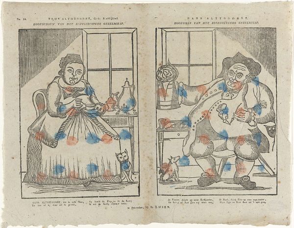 Editor: Here we have a print made between 1836 and 1849 by Monogrammist B, titled “Trijn Altijddorst, Geb: Koffijlief. / Hoofdvrouw van het koffijzusters gezelschap. / Hans Altyddorst. / Hoofdman van het bierdrinkers gezelschap.” It feels very satirical, almost comically contrasting these two figures, a woman and a man. How do you interpret this work, especially considering the emphasis on 'coffee-lovers' and 'beer-drinkers?' Curator: The print seems to delve into societal stereotypes, doesn't it? Note how the "Hoofdvrouw" (Head woman) is paired with symbols of domesticity – the table set for tea, the cat. Coffee, in this context, might symbolize feminine virtue, moderation. But look at her male counterpart. He's literally overflowing with symbols of excess – the overflowing beer stein, the belly straining against his waistcoat. These aren't just depictions of individuals; they're visual shorthands for broader cultural anxieties about gender roles and consumption. Editor: So you are suggesting that there are culturally established beliefs related to beverages that are attached to individuals? Are you referring to some cultural symbolism here? Curator: Precisely. The imagery associated with these figures—the objects surrounding them, their postures, their expressions—these are not neutral details. They tap into a rich vein of cultural associations and prejudices. Consider the dogs that appear alongside them - why those specific animals, positioned in that way? It contributes to a larger commentary about order, appetite, and societal expectation, do you think? Editor: That's a fascinating connection! The symbols around them really seem like vessels filled with cultural ideas. Curator: And the contrast, that's key, I think! These beverages act as stand-ins for gendered roles. Now that we've considered that, I wonder about modern coffee and beer adverts… Editor: Wow, I never thought a simple print could hold so many layers of meaning. It has made me reflect a lot on our daily intake. Thank you for shining light on them!