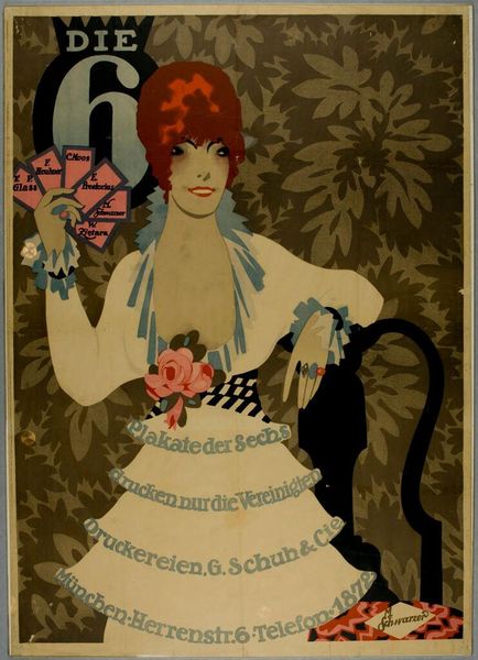 Editor: Here we have "Fête Des Fleurs De Bagnères-De-Luchon," a lithograph poster by Jules Chéret from 1898. It really grabs your attention! I find the woman in the bright dress so vibrant, especially compared to the hazy background. What catches your eye when you look at this piece? Curator: My focus goes immediately to the garland of flowers she holds and wears – emblems of transient beauty, echoing ancient rituals honoring nature's bounty. Consider also the figures in the background. What story do you think the artist wants to tell? Editor: It's like two separate worlds: a lively foreground and a faded social gathering behind her. Does this juxtaposition have a deeper significance? Curator: I think so, yes! Consider this: The flowers themselves were linked to fertility rites, celebrating renewed life. Chéret likely aimed to connect Bagnères-De-Luchon to traditions celebrating nature, through his poster's imagery and symbolism. Do you agree with this view? Editor: That's fascinating. So it’s not just a pretty poster; it’s a call back to the origins of festivals. Looking at the composition again, the blurred people do seem like ghosts of celebrations past! Curator: Exactly! Now, does knowing that change your perception of the woman, and the message the image sends? Editor: It really does. It gives a much greater depth and cultural weight to the artwork! Curator: Indeed. It prompts us to consider continuity and memory embedded within our cultural expressions. Editor: It makes me see posters, and perhaps advertising generally, in an entirely new light. Curator: Agreed, thinking about the cultural values embedded in imagery and artistic intention transforms how we engage with art.