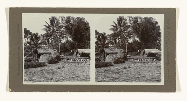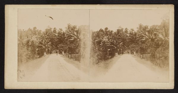 Curator: So, here we have Robert Julius Boers’s photographic piece, "Gateway to Buildings Under Trees," likely taken sometime between 1900 and 1922. It’s part of the Rijksmuseum’s collection. Quite striking, wouldn't you say? Editor: Yes, instantly, I get a sense of distance and invitation combined. The muted tones create this slightly mysterious atmosphere, almost dreamlike. Curator: Indeed. Boers masterfully uses the stereoscopic format to enhance depth. You're drawn down this path, framed by lush trees toward—what, buildings, yes, but almost obscured. I wonder if this deliberate ambiguity meant to represent an in-between space, a threshold to another world. Editor: That strong linear perspective leads my eye into the vanishing point which feels very deliberate. Look at the light and shadows as it plays through the foliage! And this pathway—smooth and unobstructed. There is this careful structuring which communicates stability, a place that might evoke quiet contemplation. Curator: I suspect there’s a tension present. Consider that he produced many of his works during a period of cultural and political complexity in the Dutch East Indies. The orientalist style romanticizes but also can sanitize aspects of colonial settings. Is this tranquil scene hiding anything? What’s obscured ‘under the trees’ as the title indicates? Editor: That reading adds so much depth. Now I'm thinking of how this so-called peaceful avenue maybe is an intentional composition masking tensions—the manicured facade hiding potential turbulence and erasure of identity within such setting. Curator: Precisely! It becomes a potent commentary on constructed narratives versus lived realities, presented using this early photographic approach to documentation—one with claims of 'authenticity' to capture place. Editor: Exactly! It’s that very tension which sparks such questions and curiosity for our visitor to pause with a fresh awareness of beauty, light and potential darker histories intertwined and carefully structured in frame, shade, and tone, no? Curator: That sums it up beautifully, and gives everyone something meaningful to reflect on during their gallery experience!