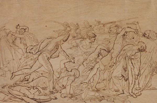 This is a pen and ink drawing of Tomyris with the Head of Cyrus, by Peter Paul Rubens. The initial impression is of freehand and loose sketchwork, giving an immediate insight into the artist’s process. The quick and expressive linework shows the artist experimenting with composition and form. Light and shadow is created through hatching, the application of fine parallel lines, bringing depth and volume to the figures. The paper's surface also plays a crucial role, its texture interacting with the ink to create subtle variations in tone and line quality. Drawing was a fundamental skill for artists like Rubens, serving as a foundation for larger paintings and as a means of exploring ideas. This piece is interesting as it is not necessarily intended for public consumption. We could see the material and process of Rubens' work to be a valuable way of documenting his thoughts and experiments at the time. By understanding the artist’s materials, we gain a deeper appreciation for the artistry and intention behind the work, moving beyond the traditional emphasis on subject matter alone.