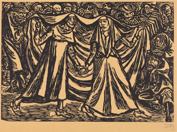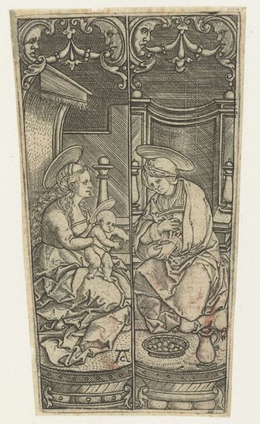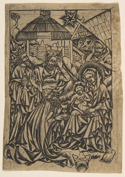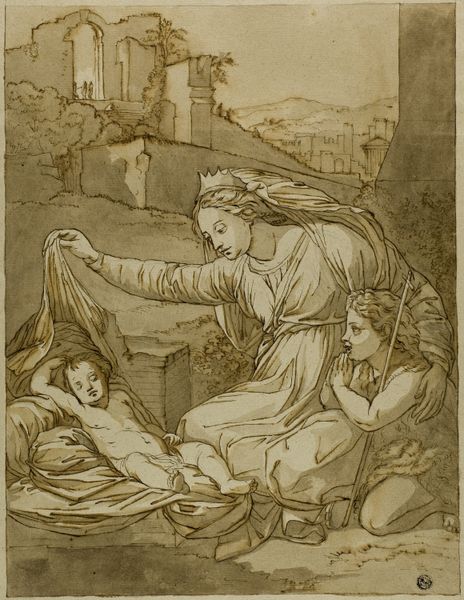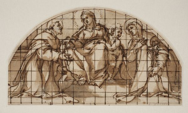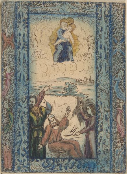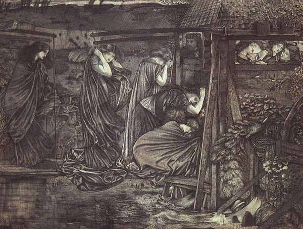Curator: Welcome. Today, we’re looking at “The Annunciation,” a charcoal drawing by Edward Burne-Jones. Editor: My initial impression is one of subdued drama. The limited color palette and delicate lines create a sense of quiet reverence despite the momentous event taking place. There's an intriguing textural contrast between the smooth figures and the detailed background. Curator: Indeed. Burne-Jones, deeply embedded in the Aesthetic movement, sought to revive medieval artistic traditions. His works often referenced religious and historical narratives, using them as vehicles for exploring beauty and idealism, and he was well-positioned in society to be accepted in prominent exhibitions, later influencing public tastes. Editor: Looking closer, I’m fascinated by the use of charcoal. It seems almost paradoxical to use such a rough, inherently dark medium to depict such a traditionally luminous scene. What considerations shaped his choice of such materials? Curator: The choice of charcoal provides Burne-Jones with a lot of tonal depth while also permitting the application of broad washes which allow for areas of dense, expressive shadow. Such materiality allows a sense of volume but retains an unfinished feel and lends the work to closer study. We see the agency and intellect of the artist reflected in such material choices. Editor: Absolutely, I can see it. The figures, though rendered with precise lines, seem almost ethereal because of that smoky effect achieved through charcoal. But more to the point, what impact does it make to remove colour in such a powerful visual narrative, especially a ubiquitous one? Curator: Burne-Jones sought a return to genuine spiritual depth amidst increasing industrialization in Britain. In rendering it in charcoal, the scene moves out of the sphere of conventional depictions and seeks a type of sublime purity. This challenges the very popular aesthetic tastes of the time, positioning the image as almost revolutionary despite its adoption of older narratives and traditions. Editor: I’m particularly drawn to how the artist uses drapery to suggest both form and emotion. The heavy folds seem almost weighted down, hinting at the gravity of the Annunciation. What did the process look like when Burne-Jones considered such choices? Curator: Many scholars note that Burne-Jones filled his studio with fabrics of varying texture and hue, enabling a hands-on exploration of form and shadow, that helped guide such compositional elements, and aided the creation of works for important public consumption in the galleries and salons of the period. Editor: It has been a fascinating and instructive dialogue, especially delving into materiality and broader cultural themes within a religious setting. Curator: Indeed. Examining Burne-Jones and his works always provides fertile ground for discourse. Thank you.