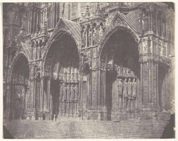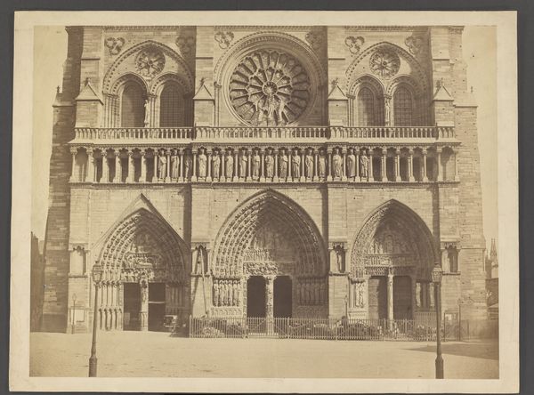 Editor: Here we have Mèdèric Mieusement’s gelatin silver print, "The Portals of Chartres Cathedral, North Side", created between 1870 and 1894. The sheer scale of the cathedral's facade, rendered in sepia tones, is impressive. I wonder, how do you see the role of this image in the broader context of the time? Curator: It’s essential to understand the sociopolitical forces at play then. Photography in the late 19th century was rapidly evolving, wasn’t it? And large architectural studies like this catered to a growing fascination with historical preservation, fuelled in part by anxieties over rapid industrialisation and urbanization that were transforming French society. Editor: That's interesting! So this isn't just about appreciating architecture, but also about capturing a vanishing past? Curator: Exactly! Chartres, with its magnificent cathedral, embodied France’s cultural heritage, and images like this helped construct a national identity tied to this past. Mieusement was likely commissioned to document the cathedral, and therefore had a public and political dimension. Does the fact that he focused on the North side tell you anything? Editor: I see… perhaps it was chosen for its specific sculptures or some historical relevance of that side? The image presents a really solid image in monochrome, emphasizing intricate carvings but I am not sure how. Curator: Think about what kind of viewer was this image intended for. The middle class could buy and display images like these, therefore supporting both the conservation and also boosting national identity. Now do you see a difference? Editor: I do! I initially just saw a beautiful, detailed photograph. But understanding the historical context makes it clear that it also served a role in shaping national identity and collective memory. Curator: Precisely! By focusing on such iconic structures, photographers actively participated in the construction of collective identity. And the very act of photographing and disseminating these images influenced how future generations would understand the role of the art, society and culture.
