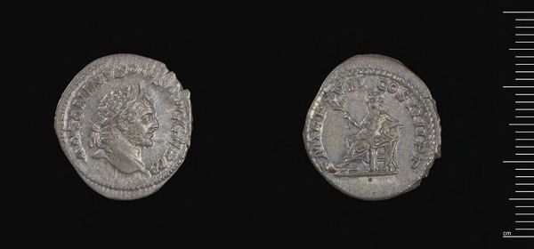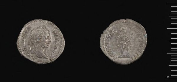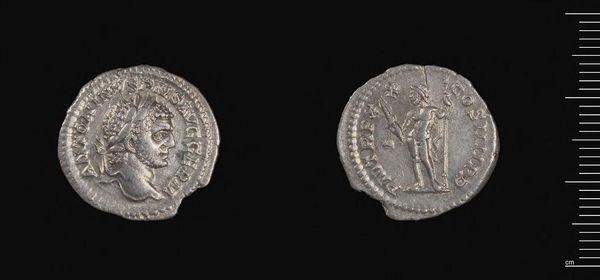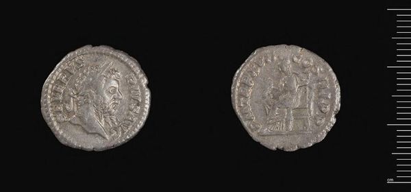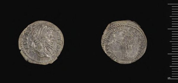 Curator: Here we have a denarius of Septimius Severus, held at the Harvard Art Museums. Editor: It's remarkably intact, given its age. The details, though worn, still give a sense of Severus's profile and the figure on the reverse. Curator: Precisely. The production of these coins was highly centralized, reflecting the emperor's control over resources and, therefore, power. Editor: I'm drawn to the composition. The circular format containing the bust, the lettering creating a frame. Curator: These coins functioned as propaganda, circulating the emperor's image widely and reinforcing his authority throughout the empire. Editor: The materiality speaks to an empire of immense reach and resources. It’s amazing to think of it passing through so many hands. Curator: Reflecting on the coin's creation gives me a renewed sense of its social and economic weight. Editor: Looking at the coin, I appreciate the aesthetic choices, the balance between portraiture and inscription.