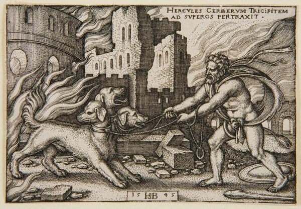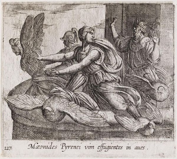 Editor: This is Pietro Santi Bartoli's "Christ Appearing to Peter near Rome." It’s an etching, and I’m struck by the contrast between the detailed figures and the almost dreamlike background. What is your take on the composition, here? Curator: Note the spatial organization—a clear foreground, middle ground, and background. Bartoli masterfully uses line to create depth and texture, drawing the eye from the earthly figures to the ethereal vision of Christ. Do you observe how the linear perspective converges towards the architectural elements? Editor: Yes, it's almost as if the buildings are witnessing the encounter. It gives the scene a sense of timelessness, doesn't it? Curator: Precisely. The formal interplay between the figures and architecture contributes to a profound meditation on faith and power. Editor: That's fascinating; it really makes you consider the relationship between earthly and divine realms within the artwork.