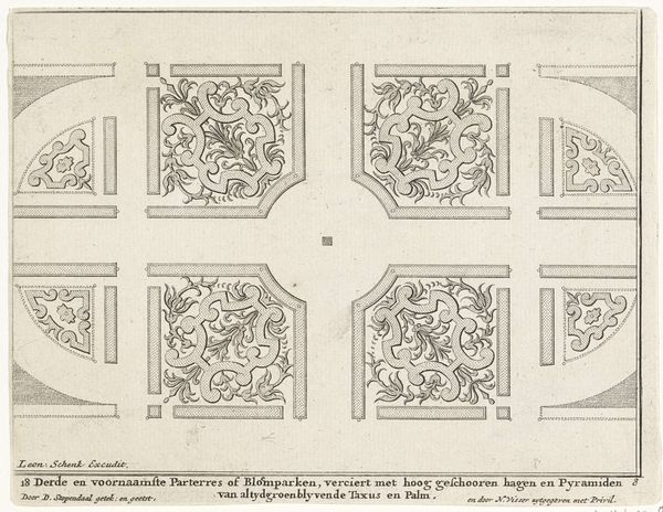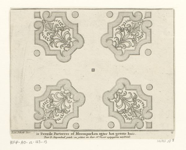 Editor: This is "Plattegrond van de eerste bloemperken bij Huis Clingendael," a print, possibly dating between 1682 and 1746, by Daniël Stopendaal, housed in the Rijksmuseum. It depicts a geometric garden design. I am struck by the intricacy and formality of the layout. What stands out to you when you look at this work? Curator: Immediately apparent is the artist’s strategic use of line and form to generate spatial order and balance. Consider the semiotic structure, specifically how the repeated geometric patterns communicate the formal garden's cultivated control over nature. The baroque sensibility is clear when observing how light plays across the linear depth generated by the etching technique. Editor: You focus on form, which makes sense, but I'm wondering about context. Doesn’t understanding the Clingendael estate's history affect our interpretation? Curator: While sociohistorical data provide auxiliary insights, such an inquiry directs our critical attention outward, away from the art object. Here, close observation demonstrates how the engraving creates a contained visual system through repeating motifs, demonstrating formal harmony. The shapes are self-referential, forming a complex but visually balanced unit. Editor: So you’re less interested in the ‘why’ of the garden and more in how the design itself communicates ideas about order and control. Curator: Precisely. Look at how the symmetrical balance interacts with the textured hatching of the engravings; this builds toward complex layers that reveal a deeper unity in form and execution. Editor: I see what you mean. By focusing on these formal elements, the artwork really can be seen as communicating its intentions. I'm beginning to appreciate the formal elegance Stopendaal achieved. Curator: Agreed. Reflecting on the systematic organization of its composition allows us to perceive an order not solely decorative but expressive of larger philosophical ideals.