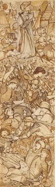 Curator: Today, we’re examining “The Deliverance of St. Peter from Prison,” a drawing by Edward Burne-Jones. He worked with ink and colored pencils to bring this dramatic scene to life. Editor: My goodness, it’s rather dreamlike! It feels as if I’ve stumbled into someone’s fantastical, history-soaked vision. Everything has soft edges, an ethereal quality that feels utterly compelling. Curator: Absolutely. Burne-Jones situates himself within the Pre-Raphaelite movement which turned to Medieval and early Renaissance art for inspiration, focusing on narratives, intense colors, and complex compositions. This particular scene depicts the biblical story of St. Peter's miraculous escape. Think about the symbolism here: unjust imprisonment versus divine intervention and liberation. Editor: It strikes me how the artist focused more on atmosphere than precise detail. The sleeping guards are wonderfully oblivious to the angel guiding St. Peter—a divine intervention played out amid everyday indifference. I keep thinking about how the light in the work has a golden quality about it! Curator: That's a key element of Burne-Jones's style, that very warmth is what helps pull the viewer into that divine moment and separates the sacred from the mundane as St. Peter is guided away from the suffering around him. Editor: It gives the work such an affecting glow and truly highlights the ethereal feeling of the subjects. What’s particularly evocative is the angel’s guiding gesture toward St. Peter. Their robes and features blur into a hazy vision of divine intervention, giving the moment weight. Curator: I agree. Considering its focus on freedom and escape, this piece can open dialogue about oppression and resistance, offering a visual metaphor for breaking free from unjust systems. Editor: Yes, now seeing what freedom can entail and mean when escaping suppression, I love the work so much more! A lot to think about for such a still scene.