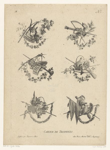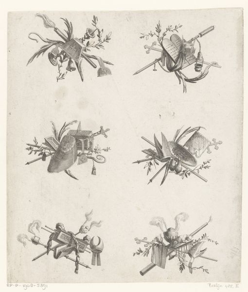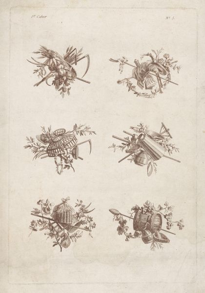 Editor: Here we have an engraving from between 1751 and 1798 entitled "Trofeeën," made by an anonymous artist. I notice there are five groupings of different objects: books, horns, flowers… it almost looks like still lifes, but abstracted somehow. How do you interpret this work? Curator: These "trophies" of objects speak volumes about the values and priorities of the late 18th century, when knowledge, artistic pursuits, and perhaps even the military, were elevated as sources of status and cultural capital. Consider, who has access to these objects, these instruments of knowledge? The engraving isn't just a pretty picture; it’s a reflection of a deeply stratified society. What does the printing process itself say about access? Editor: I hadn't thought of it that way. I was focusing on the arrangements themselves as being almost whimsical, but it makes sense that there is a level of privilege involved. The engraving medium would allow more people to have access to the imagery than, say, an original painting. Curator: Precisely. It becomes a tool for disseminating ideals, shaping public perception. What stories do these idealized arrangements tell, and who gets to write them? And, of course, who is left out? Editor: So, in a way, it is also making a statement by excluding the working class from that kind of lifestyle and learning? Curator: Absolutely! Think about the implications. Art is never created in a vacuum. "Trofeeën" gives us a peek into the intricate dance between artistic expression, societal structures, and power dynamics of the 18th century, especially in relation to class. Editor: This makes me look at art completely differently! Thanks! Curator: My pleasure.