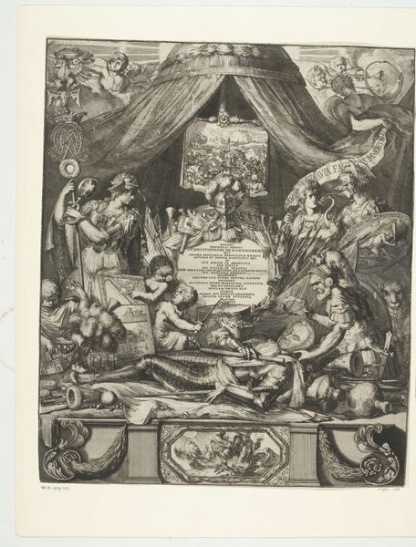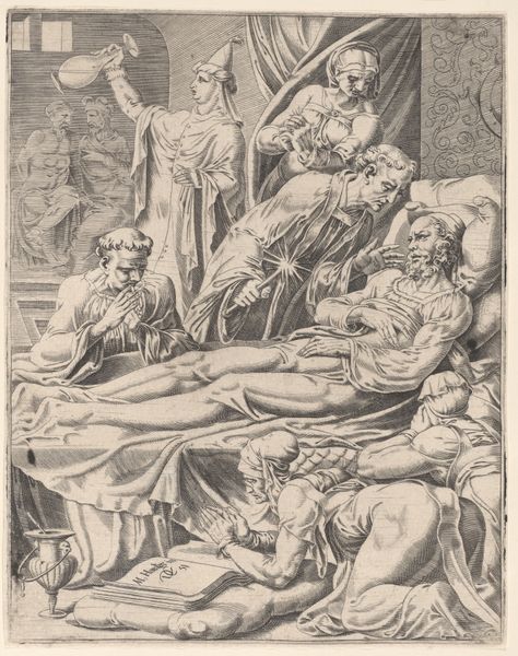 Theodoor Galle produced this engraving titled “The Starvation Death of Duke Ugolino della Gherardesca” sometime between 1592 and 1633. It’s a scene lifted from Dante’s Inferno, recounting the tragic imprisonment and starvation of Ugolino and his sons. Made in the Netherlands, this print reflects the period’s fascination with classical and literary themes, filtered through a Northern European sensibility. Galle, working within a well-established printmaking industry, would have been catering to a market of educated elites interested in moralizing narratives. The image doesn't shy away from depicting the grotesque reality of starvation, yet it also frames the event within a moral and historical context. The figure in the foreground, a river god, perhaps symbolizes Ugolino's past power contrasting with his present state. To truly understand this work, one can delve into the history of Dante’s influence, the culture of printmaking in the Netherlands, and the political context of the Ugolino story itself. By looking at these sources, we can better understand how Galle's image participates in a broader dialogue about justice, power, and human suffering.