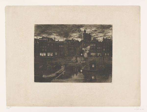 Editor: This etching, "River View in Ghent by Moonlight," crafted sometime between 1849 and 1883 by Egide François Leemans, offers such a mysterious and atmospheric view. The muted tones create this captivating scene. What strikes me most is the contrast between the stillness of the water and the busy sky above. What do you see in this piece? Curator: I see a negotiation of power through imagery. Consider Ghent's socio-political landscape in the mid-19th century. The architecture, dominated by church spires, speaks to religious authority. Yet, the moon, often a symbol of the Romantic era's embrace of nature and the sublime, casts an egalitarian light. It illuminates all aspects of society – grand buildings and modest homes – leveling the playing field, visually at least. Do you think the artist was making a deliberate commentary? Editor: That’s a fascinating perspective! It’s so easy to just see the aesthetic qualities, the soft light and quiet scene. But thinking about the “leveling” effect of the moon’s light, as you put it, makes me consider that this image could have social implications too. I wonder how it would have been received at the time? Curator: Likely within elite circles and academic salons, venues where the politics of art and imagery were hotly debated. Prints like these were often circulated as markers of cultural sophistication. But don't underestimate the potential for a wider impact. What role could prints like these play in shaping a national or regional identity? Editor: I see your point. Visual representations of a city definitely play a role in civic pride and can influence perception, even today! I've certainly learned a lot about seeing beyond just the immediate aesthetics and thinking more critically about context and power dynamics at play in art. Curator: Indeed. Art is never created in a vacuum; its social life often outlives its creator's intention. Looking deeper helps reveal the broader story it tells.