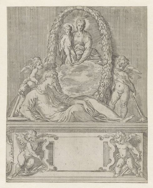 This engraving, titled "Maria gekroond door Christus," comes to us from the hand of the Master of the Dice. Contemplate its composition—a balanced, symmetrical arrangement that leads the eye upward through distinct registers, from the earthly realm to the divine. The artist's lines, rendered in meticulous detail, construct a scene rich with theological symbolism. Observe how the rigid architectural forms contrast with the fluid drapery and the soft, voluminous clouds. This juxtaposition creates a visual tension, highlighting the intersection of the sacred and the secular. The symbolic language used, from the dove representing the Holy Spirit to the lion symbolizing strength, invites us to decode the underlying structure of the artwork. This encourages us to reflect on the complex interplay between power, divinity, and representation within the cultural context of its time. Ultimately, this print serves as a testament to how formal elements can convey profound ideological meanings.