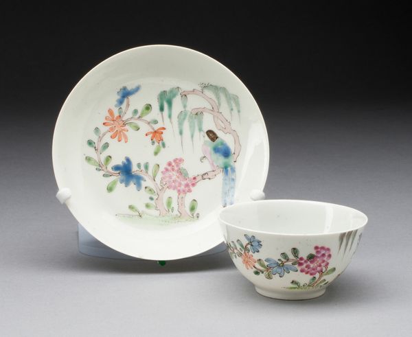 Curator: It’s delightful, isn't it? This cup and saucer was produced around 1770 by the Höchster Porzellanmanufaktur GmbH. Both pieces are rendered in fine porcelain. Editor: My first thought is that it evokes such delicate privilege. The pastel colors and detailed renderings of fruit and birds are almost overwhelmingly precious. Curator: Precious, yes, and entirely intentional. These pieces emerged during the Rococo period, which favored asymmetry, grace, and elegance – values reflected in aristocratic society at the time. How fascinating to consider these porcelain artworks within the context of class. Porcelain itself was highly prized, wasn’t it? What statement was being made through its ownership? Editor: Absolutely. Porcelain operated as a potent signifier. The ruling classes cemented their power through visual extravagance—emphasizing distance from the laboring population who produced everything, and indeed lacked any parallel consumption opportunity. Did the imagery carry a deliberate message beyond a signifier of pure wealth? Curator: I think we need to examine the symbolism further. The motifs of birds and fruit, meticulously painted on both the cup and saucer, evoke notions of abundance and perhaps even earthly paradise, subtly reinforcing a sense of divinely ordained right to opulent enjoyment of life. In our present context of material ethics, how can this function today? Editor: Exactly. Looking at the history of production and consumption gives it a much sharper edge now. This is not mere frivolity; these objects actively participated in constructing and communicating power, wealth, and exclusion in the 18th century. We, today, should grapple with how such privilege reverberates across time. Curator: An important note, and especially considering these porcelain items are now housed within an institution supported by public funding and visitor engagement. Thinking about it, viewing them in such proximity also shifts that earlier symbolism and association. Editor: Precisely! Hopefully, we have provided food for thought during this tour of ceramic and porcelain work! Curator: A stimulating start for our listeners indeed.