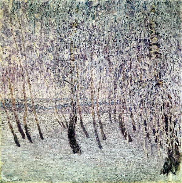 Igor Grabar made this painting, The Frost, with oil on canvas. It's like looking through a window into a world made of light and cold. The way he built up the image from tiny strokes of color, reminds me of those optical mixing experiments of the pointillists. Every touch feels considered, a testament to the labor of seeing. Look closely, and you can feel the chill in the air, see the way the frost clings to every branch. I'm drawn to how Grabar captures the light, the way it shimmers and dances across the snow. It reminds me a bit of Monet’s explorations of light and atmosphere. Ultimately, this painting is a reminder that art is about more than just representation; it's about feeling, about the exchange between the world and ourselves.