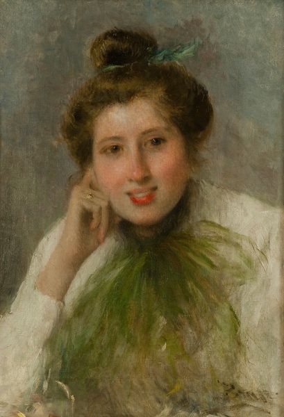 Curator: Before us, we have "A Portrait of a Lady with a Red Shawl" by Raimundo de Madrazo. Editor: She possesses an alluring aura. Her gaze holds me, doesn’t it you? A visual magnet, drawn into her warmth. Curator: Indeed. Shawls are potent signifiers, embodying warmth, comfort, and often, cultural identity. This crimson shawl hints at a passionate nature and possibly Spanish heritage, which given the artist, would make sense. The ornate paisley pattern woven within, itself evokes tales of travel and trade routes, suggesting an intercultural narrative woven into her very attire. Editor: The contrast between the dark backdrop and the luminous shawl truly captivates. It seems almost strategically placed to draw our eyes upward towards her expression, highlighted in turn. And see how the soft brushstrokes and subtle blending create a palpable sense of texture and dimension! It feels very intimate, as though we're encountering her in a fleeting, personal moment. Curator: Quite right. Furthermore, consider the green ribbon woven in her hair—a hue that signals hope and renewal, yet offset by her somewhat melancholic eyes. This position sets up an interplay of emotion. This subtle detail enhances the complexity of her character. Is it optimism or resignation we witness? Editor: What's remarkable to me is Madrazo's technical facility. Light and shadow play exquisitely across her face, subtly shaping her features with remarkable realism. Observe how the brushwork remains visible yet serves the image faithfully. And what is more, these techniques all draw me into the psychological depths of the sitter. It’s art working upon us, rather than the reverse! Curator: A thoughtful assessment. Shawls not only offer physical protection but become emotional shields, and emblems of solidarity, representing an embrace of community and heritage that extends far beyond the purely aesthetic. It’s that shared human story the image invites us to consider, making it transcend simply being a "portrait." Editor: Very well put. The beauty of art lies indeed in this conversation—between artist, subject, and finally, the observer who completes the circle of meaning. The more we analyze it, the richer it gets. Curator: Agreed. Hopefully, our dialogue here offered another way of considering art as an evolving exploration, not a fixed declaration.