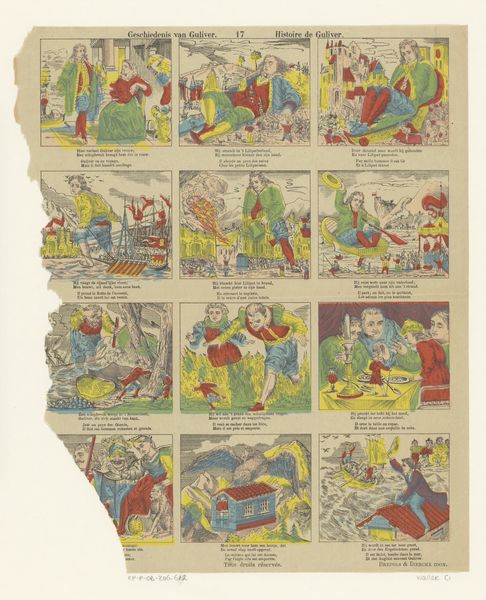 This undated print by Pellerin & Cie, titled “Jantje de toovenaar en zijne moeder,” presents a comic-strip narrative, common in popular culture, which provides insight into the social dynamics of the time. The story unfolds through sequential images featuring Jantje, a boy with magical abilities, and his mother, likely in a rural setting. The artwork touches on themes of childhood, domesticity, and the supernatural, reflecting a culture grappling with traditional beliefs and emerging modern ideas. While seemingly light-hearted, the imagery subtly reinforces societal norms regarding gender roles, with the mother depicted in domestic settings and Jantje engaged in more adventurous pursuits. The narrative also explores the complex relationship between mother and son, portraying both conflict and affection. The emotional nuances of the artwork resonate with broader societal issues, inviting viewers to reflect on their own experiences and relationships within the framework of cultural expectations.
