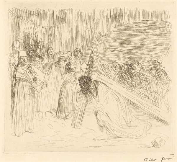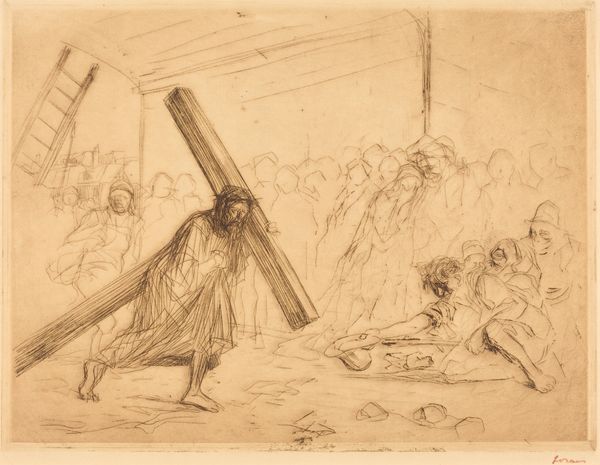 Jean-Louis Forain’s etching captures Christ’s burden, the cross, heavy with historical and spiritual weight. The cross, an instrument of torture, becomes a symbol of sacrifice and redemption, rooted in early Christian iconography, yet echoing pagan symbols of cosmic balance. We see variations of this motif across cultures: the Egyptian ankh representing life, or the Celtic cross, intertwining Christian symbolism with ancient solar worship. Here, it transcends mere religious artifact, embodying humanity's collective suffering. The stooped posture of Christ, burdened yet resolute, is mirrored in depictions of Atlas bearing the world, or Sisyphus eternally pushing his boulder. These archetypal images tap into our subconscious understanding of struggle. This image resonates because it touches the part of us that understands cycles of suffering and hope. The cross becomes a signifier for human resilience. These visual echoes reveal the endurance of symbolic language, constantly reshaped by cultural memory, and resurfacing in our collective consciousness.