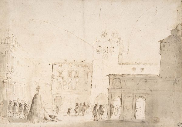 Curator: Here we have Louis Jean Desprez’s "Promotion médicale," a pencil and ink drawing from around 1790, currently held in the Rijksmuseum collection. What strikes you first about this piece? Editor: Immediately, it’s the theatrical scale, but rendered in such muted tones. It feels like looking at a grand stage set just before the actors arrive, or perhaps a fading memory of a civic event. Curator: Exactly! Desprez, as an architect and artist deeply involved in stage design, frequently blurred the lines between real spaces and theatrical environments. His drawings offer fascinating glimpses into how civic rituals and displays of power were visually constructed during this period. Consider the historical context; it's right before the French Revolution. Editor: The architecture dominates, though the little figures gathered remind me of social stratification, the haves, and have-nots of society. Who has access to such architecture, the wealth it displays? Where are those whose hands built the monuments and dwellings portrayed? The figures are secondary, but I find them haunting, almost specters haunting grand locations and events. Curator: Absolutely. We see neoclassical architecture, a movement itself steeped in ideas of order, reason, and a harking back to an idealized past. This artistic decision tells us much about the tastes and aspirations of the elite commissioning these works. The choice of pencil and ink adds to this with an almost archaeological or documental tone. Editor: But what’s being "promoted?" It could be literally medicine or symbolically perhaps as civic institutions and ideology of progress that also excludes so many at the margins. Desprez invites us to look critically at what these imposing facades represent in a social and political context. It's as much about who's included as who's conspicuously absent from the frame. Curator: It's an image that certainly makes one question what power and wealth truly signifies. Editor: The city becomes both stage and spectacle, reminding us to ask: Whose stories are being told? And whose are being actively erased or never get the light? Curator: Ultimately, this piece asks how institutions legitimize themselvesso well-articulated!