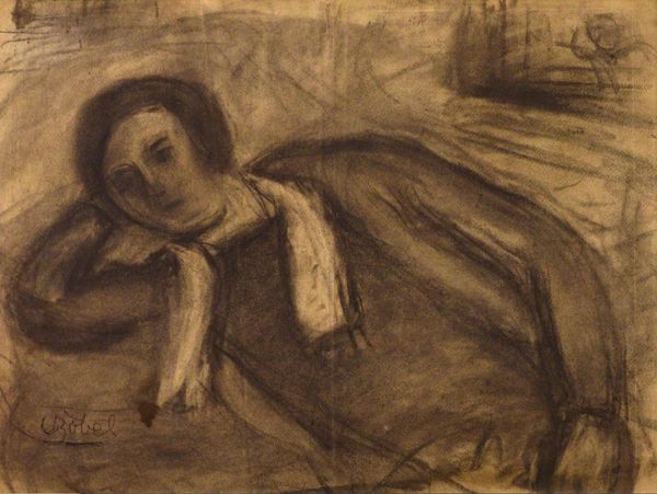 This is Bela Czobel's "Head," a drawing whose date remains a mystery, but it offers insight into the artist’s exploration of form and emotion. Czobel, born in 1883, lived through profound social and political upheaval across Europe, and like many artists of his generation, his work reflects the anxieties and uncertainties of a rapidly changing world. Here, the subject's gently tilted head and closed eyes suggest a moment of introspection or perhaps resignation. It is difficult to discern much about the person, their gender, or class, and the subject seems to retreat into themself. The lines surrounding the figure are dark and roughly drawn as if to entrap the subject in their own mind. Czobel lived through two world wars and multiple social and political movements, and in this portrait, we can see the face of someone retreating from the world. It is a moving piece that shows the emotional toll taken on many by the events of the 20th century.