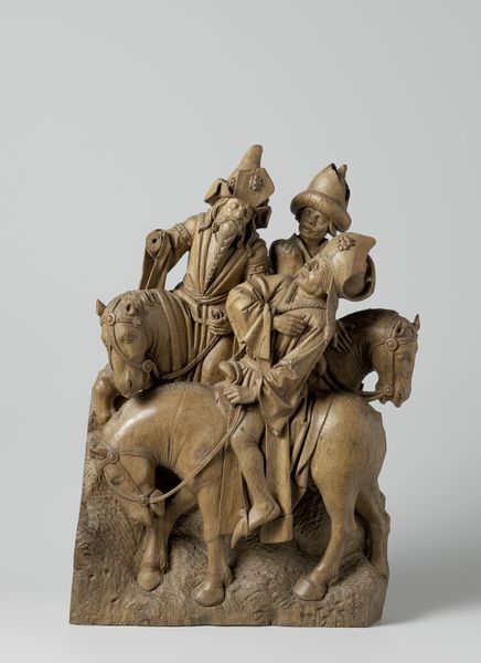 Antoine Le Moiturier created this terracotta Nativity scene in the 15th century. Its spatial structure is divided into a foreground and background, creating a stage-like space. The linear details define the figures and architectural elements, and there is a rough, unfinished quality to the outer edges. The scene has an earthy palette of beige and brown hues with subtle touches of red and gray, adding depth to the sculptural forms. The composition invites an examination of perspective and the arrangement of figures within space. The use of a raised plane for the Nativity scene creates a layered effect, reminiscent of early Renaissance experiments with depth. We can explore the relationship between the earthly and the divine through the structure and how it challenges conventional representations of sacred space. The scene becomes a point of intersection where formal structure and semiotic meaning collide, offering insights into the artistic and philosophical values of its time. Consider how the artist uses form and structure to convey meaning. This is not simply a depiction of a Biblical event, but an opportunity to engage with the artistic and philosophical principles of the era, inviting a dynamic interpretation that continues to evolve with each viewing.
