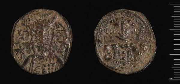 Editor: Here we have a coin of Constantine X. The patinated bronze really emphasizes the depth of the relief. What do you see in this piece? Curator: Observe how the composition is bisected. On one side is what seems to be an iconic representation of Christ, while the other features imperial figures. The bilateral symmetry suggests a kind of balance between the sacred and the secular. Editor: That's interesting! I hadn't considered the balance. Curator: The very materiality of the coin serves to integrate these representations into a functional object of governance and commerce. It's a fascinating interplay of form and function. Editor: I see! Thanks for pointing that out.