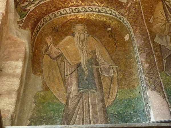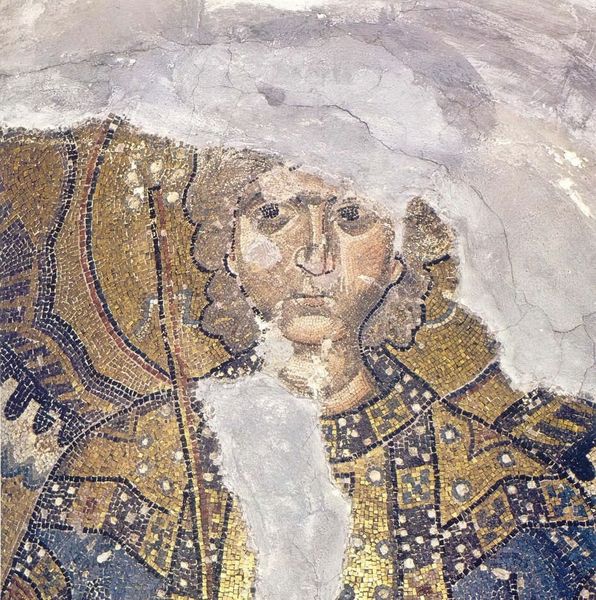 Curator: Welcome. Here we have a fragment of the "Virgin Mary on Deesis Mosaic," created around 1261. It’s a work of Byzantine art found here in Hagia Sophia. Editor: Wow. Despite the damage, there’s this incredible stillness. That downturned gaze just pierces you, doesn’t it? So human, almost sorrowful. Curator: Indeed. The damaged portions actually amplify its effect; the visible tesserae draw attention to the materiality, making us aware of its construction, the deliberate placement of each piece to build up form and feeling. Editor: Like little tears, those missing bits. And the gold leaf halo… it shimmers even now. Talk about capturing the divine in something earthly! How would you describe the composition formally? Curator: Note how her head inclines towards Christ—that isn't present in our segment. The perspective, the flattening of planes typical of Byzantine art, elevates her to an icon, more than merely a portrait. Also, consider the subtle gradation of color within her face—pale pinks and creams against darker shadows. Editor: It's less a likeness, more an invocation. The colours, faded as they are, still possess such a raw elegance, they glow. I wonder what it was like when freshly laid? I find myself contemplating themes of fragility and timelessness here. Curator: Precisely. It prompts consideration about the ephemeral nature of earthly beauty against the backdrop of a theological cosmos. And the hieratic scale… while this is only a portion, the implied scale suggests a grand representation. Editor: Definitely grand. There’s something so arresting about capturing a moment, however solemn, and freezing it like this, in tile. It invites quiet introspection. A beautiful work. Curator: It prompts a sense of reverence that resonates beyond the purely aesthetic, particularly knowing where this segment existed originally within the Deesis. Editor: For me, it's all about the intimacy conjured up amid such history. You gaze upon it and immediately ponder its making, its history, and our mortality, don’t you think?