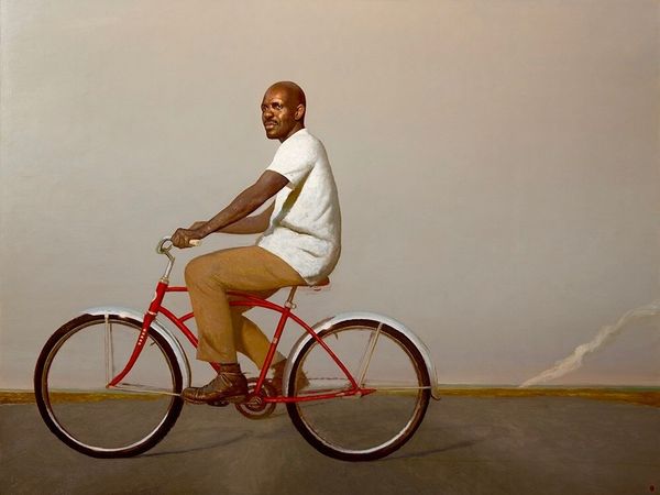 Editor: Bo Bartlett's 2019 oil painting, "Freedom," features a man on a bicycle pulling a small cart, with an American flag attached to the back. The painting evokes a sense of weariness combined with determination. How do you interpret this work, especially given its title? Curator: The painting's title, "Freedom," when juxtaposed with the figure's burdened journey, really prompts us to consider what freedom truly means in an American context. This man, likely a Black man given Bartlett's broader body of work and the art historical allusions that he likes to layer into his paintings, seems to be carrying the weight of history—a history marked by systemic inequality and the unfulfilled promises of freedom for all. Editor: I see that. The flag, normally a symbol of unity and patriotism, feels almost…ironic here? Curator: Exactly. The presence of the American flag asks us to consider whose freedom is being celebrated and at what cost. Is this a representation of the American Dream, or a critique of it? We have to ask who can attain it, and who remains on the margins. It forces a dialogue around the lived experience of marginalized people and challenges the romanticized notions of freedom often associated with American imagery. The very earth and the water that pool in the road ahead have a heavy feeling in how they are painted. It adds to the mood so much. Editor: It’s almost as though the figure's individual journey becomes a broader commentary on the state of American society and its ideals. The word "Freedom" as a title is very fraught! Curator: Precisely. By bringing a philosophical lens we confront how "freedom" functions both as a rallying cry and a measure of inequality, a constant push for something still yet unrealized. Editor: I’m beginning to see how the artwork challenges conventional readings of national identity and opens space for deeper reflection. Curator: Yes, the visual vocabulary of "Freedom" can prompt questions about patriotism, belonging, and social justice that might be very challenging, even discomforting, and ultimately transformative. Editor: Thank you, I really see the importance of situating art within complex sociopolitical contexts and letting that inform our experience.
