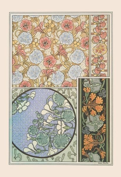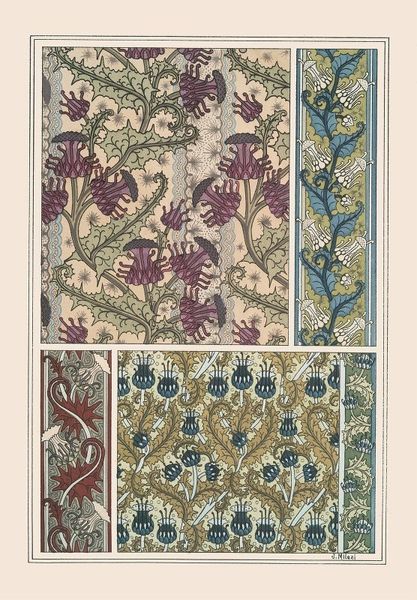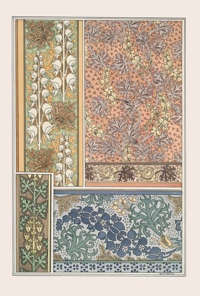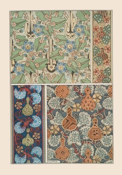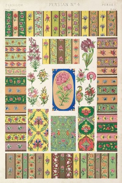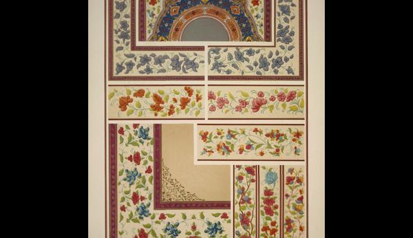 Owen Jones created "Illuminated Manuscripts No.3," which are vibrant lithographic plates. Jones was deeply influenced by his travels in the Mediterranean, including his time in Egypt and Spain. Jones' designs draw from a variety of historical sources, but it was his time studying the ornamentation of the Alhambra that had the biggest impact on him. Jones adapted the ideas of Islamic design, which typically avoided figuration, to develop non-representational patterns that were applicable to the Victorian interest in pattern and ornament. The patterns that are displayed are both flat and dynamic. Jones saw historical design as a tool for uplifting contemporary British design and culture. These designs invite you into a world where historical and cultural narratives are interwoven, reflecting his vision for a more enlightened and aesthetically rich society.