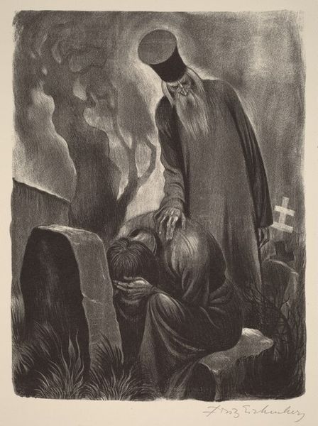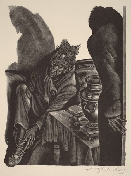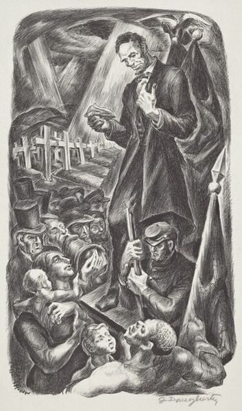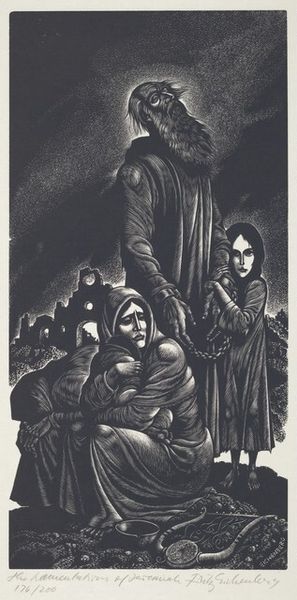 Editor: Here we have Fritz Eichenberg's wood engraving, "The Peasant Called It a 'Babe'", created in 1949. The scene is incredibly striking and, frankly, disturbing. There's such a heavy reliance on stark contrast, emphasizing the ghoulish faces. What are your thoughts on this print? Curator: It’s fascinating to observe how Eichenberg orchestrates this composition through chiaroscuro. The artist's sharp cuts create strong tonal contrasts that delineate the figures, pushing some into stark relief while others recede into the darkness, intensifying the emotional tenor of the scene. Notice how this creates a sense of spatial ambiguity, where figures seem to emerge from the shadows. Editor: The figures are what grab me. Their expressions are so exaggerated, so tormented. Curator: Precisely. Note the deployment of caricature. Eichenberg distorts the features, amplifying certain aspects to communicate the grotesque. Observe the hooded figures that function almost as a Greek chorus, their uniformity disrupted by individual expressions of horror and malice. Consider too, how these faces are constructed. Does their linearity and sharp angularity give any hints to the possible message the author wishes to convey? Editor: I guess I hadn't considered the lines so carefully, but you are right. They feel very harsh, like the expressions are etched onto their faces. So, are you suggesting the artist is using form to communicate the mood and message here? Curator: Precisely. The interplay of light and shadow, the exaggerated forms, all coalesce to generate a visually arresting image that probes the depths of human emotion and the darker recesses of the human psyche. Through mastery of form and composition, this piece stands as a compelling exploration of both technical skill and emotional intensity. Editor: This makes me see it differently. I focused on the subject, but analyzing the composition has opened up new perspectives on how it creates the overall mood. Thank you.