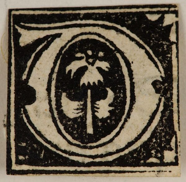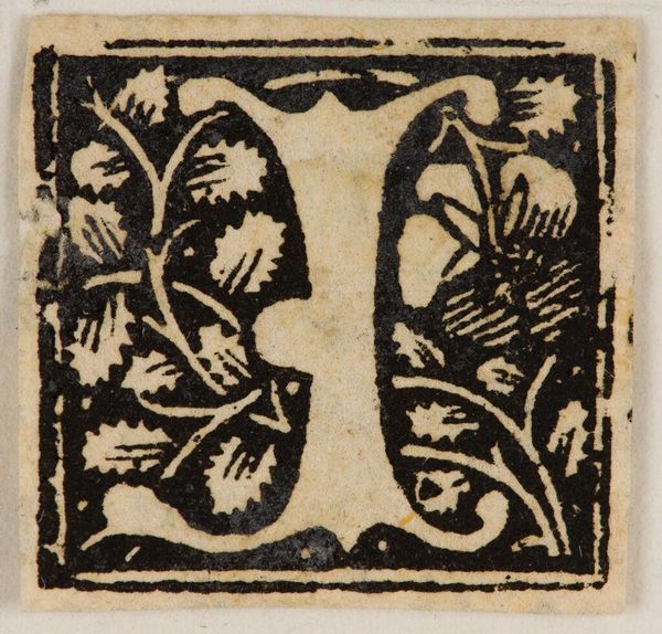 Editor: This is a woodcut titled "Initial T," by an anonymous artist. The stark black and white contrast gives it a bold, graphic quality. What compositional elements stand out to you? Curator: Observe the interplay between positive and negative space. The artist uses flora, framed within the letterform, which creates a dialogue between representation and abstraction. Notice the crude, almost playful, execution of the bordering. Editor: So, it is not just a letter; it's a study in contrasts. Curator: Precisely. It transcends pure utilitarianism, demanding that we contemplate its visual structure and artistic intent. Editor: I see it now. Thanks! Curator: My pleasure.
