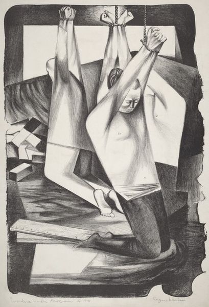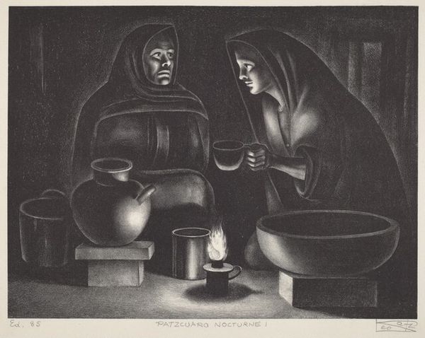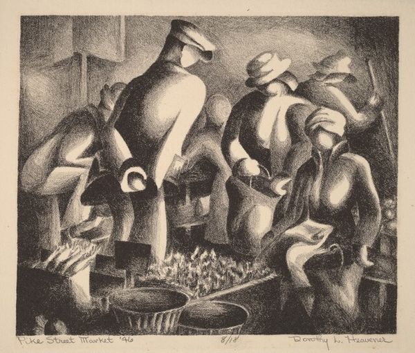 Curator: Alright, let's turn our attention to "Hurt Performer," a graphite drawing and print by Simka Simkhovitch. I believe this piece invites a profound contemplation of the human condition. What springs to mind for you? Editor: Initially, it's the texture of graphite on paper that grabs me; the meticulous layering creates such a shadowy backstage atmosphere. Also, these figures are very theatrical with the circus props, jug, wash basin... It brings to mind questions of labor, not glamorous, but material. Curator: I can appreciate that. Simkhovitch, for me, taps into the weariness behind the mask, literally. There's an aura of melancholy here, a revelation of vulnerability that lurks beneath the surface. It seems as if Simkhovitch wishes to offer an entry-point into the quiet despair of his characters and their performance. Editor: Interesting that you note the use of the mask, I note here also the almost sculptural handling of the human form, like pieces molded, assembled, and dressed for work, echoing a concern with production—not only that of theatre, but perhaps with the manufacturing of a spectacle. Curator: Ah, that's wonderfully observed! You see, to me, this work sings a dirge for dreams deferred. A stark black-and-white palette accentuates the underlying emotional tension, and hints that any colorful hope or imagination is forever being pushed back to give space to daily realities and survival. Editor: Right, black and white also mirrors the limited possibilities within their constructed world. One has to admire though how much work went into preparing it and getting it to look as real as it can to its public, as if made possible simply out of graphite on paper with layers and layers. Curator: Yes, in contemplating this genre-painting and the historical moment captured, it’s hard to ignore a subtle critique on the pressures faced by artists—the requirement to continually produce, entertain. But who is attending to their wounds, or simply appreciating the toil? Editor: A powerful piece. It makes you wonder what commentary it offers for artistic or artisanal creation, highlighting the intense labor involved, the cost to the worker or artist, as well as society’s gaze on the making of it all. Curator: Agreed. And that’s what makes Simkhovitch such a compelling storyteller for me. Editor: Absolutely, a conversation between technique, story, and the stark realities of existence.