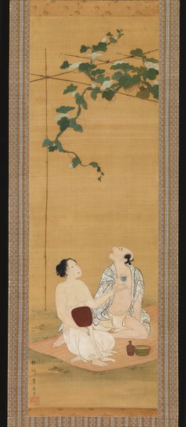 Editor: Here we have "Chinese Portrait Painter," dating back to the 18th century. It's currently housed here at The Met. It appears to be a painting executed in gouache and watercolours. There's an undeniable sense of intimacy conveyed through its composition, don't you think? What are your thoughts on this particular work? Curator: Note the bi-fold screen format, its compositional structure being dictated by that division. Consider the painter on the right: seated, rigidly posed. Observe how his gaze is fixed intensely on the figure held up in front of him in a frame. What effect is created by that juxtaposition between artist, image, and portrayed woman? Editor: I see. It feels very staged, and a little flat… Curator: Precisely. And consider the composition's flatness. How do the restricted range of tonal values, along with the textured gold background, contribute to that flattened perspective? There is an ambiguous spatiality at work. Editor: It definitely highlights the picture plane itself, doesn't it? Like it is asserting its two-dimensionality? What does the screen format mean here? Curator: Good point. As a folding screen it would act more like sculpture than painting, right? It might then activate three-dimensional space, not create an illusion of space. The very idea of perspective collapses here…and a dialectic develops. We are neither looking at the painting, nor "through" the painting, so the gaze and pose become artificial and mannered…a deliberate flatness becomes pronounced. Editor: That’s a very astute point. Thank you. Now, I notice how the artist is presented in the very artwork itself. We see painting as something inherently self-referential. This perspective has really given me a different lens to see this work, rather than looking for narrative. Curator: And perhaps, from here, a better grasp of the dialectical relation of image-making to materiality, too.