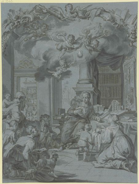 Curator: Immediately, I’m struck by the asymmetry and instability of the composition; there’s a distinct lack of grounding. Editor: We’re looking at "Pallas Athene in het atelier van Prometheus" created sometime between 1752 and 1819 by Jurriaan Andriessen. The Rijksmuseum houses this delicate work rendered with pen, watercolor, and coloured pencil. Curator: The use of watercolor lends an almost ethereal quality, yet the linear precision, particularly in the architectural rendering, attempts to impose order. But look at how the arch at the top is misshapen! And those washed-out hues drain away the classical power that a depiction of Athene and Prometheus would be expected to hold. Editor: Absolutely. And notice how Athene, typically a figure of strength and wisdom, is presented as almost vulnerable. The setting, in Prometheus's workshop, hints at a moment of creation but also, perhaps, a dependence on mortal ingenuity. Curator: Precisely. Consider the figures themselves—the classical references mixed with figures that seem more contemporary. This disjunction produces visual tension. Editor: Andriessen uses potent symbolism, doesn’t he? Prometheus, a bringer of knowledge, interacting with Athene, a goddess deeply intertwined with civilization, crafts an allegorical message—possibly regarding the complicated dance between inspiration and societal advancement. There is something about Athene receiving aid or instruction that stands against orthodox accounts of their roles in civilization. Curator: The visual weight of figures on either side of the canvas gives balance and cohesion to this bustling studio; I'd say the composition invites a reading of human intervention within a pre-existing social and ideological structure. It has an uncanny appeal to me. Editor: Yes, I find myself rethinking familiar narratives—a testament to the artwork's complexity and ability to reframe mythological archetypes for successive generations. The light is evocative and serves the message well.